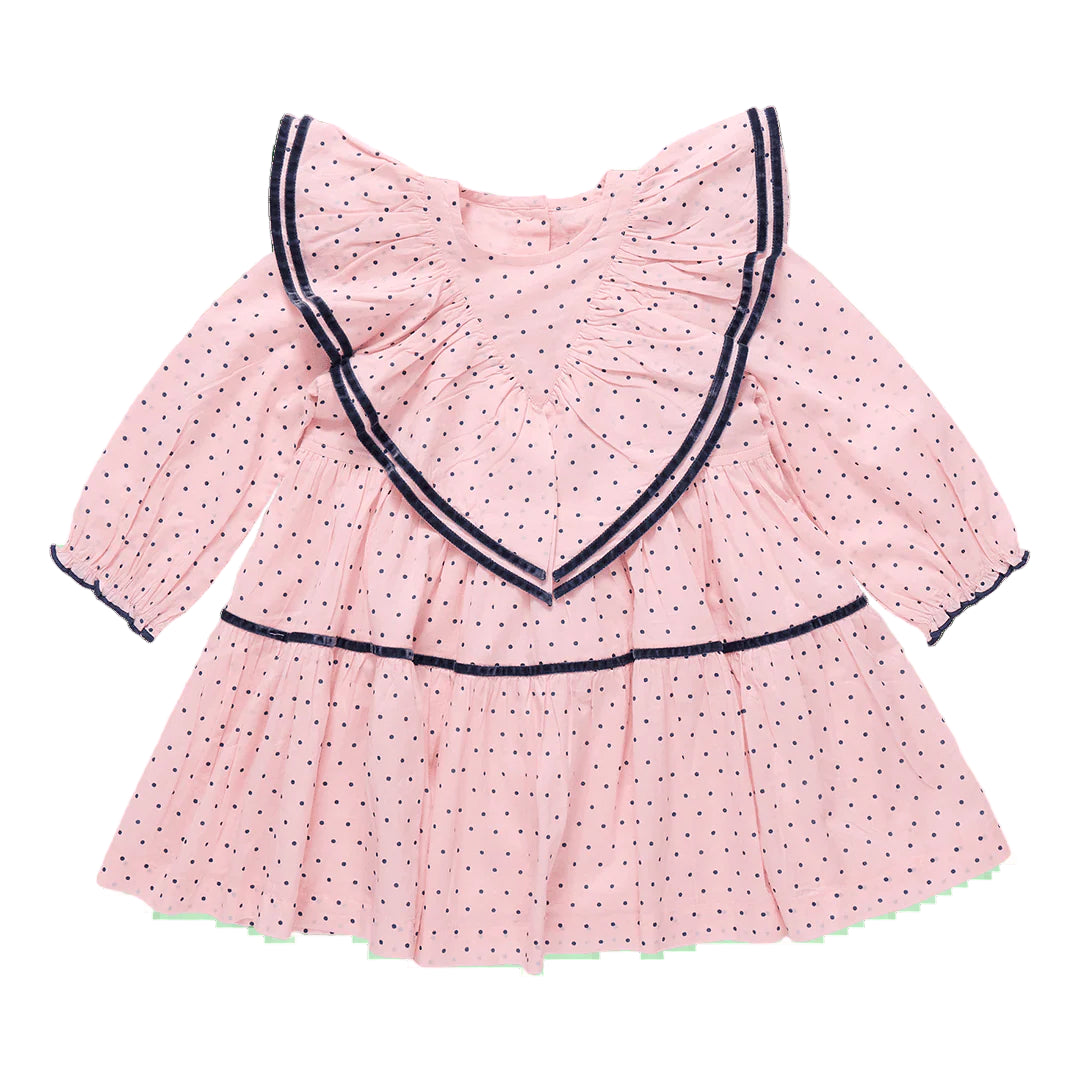 Vintage Vibes! Our long sleeve Girls Raphaela Dress seamlessly moves from school days to ice cream socials. A velvet-taped, pointed ruffle bib detail flutters at the front and lends a sense of nostalgia and the fully lined two-tiered skirt encourages twirling until twlight. A glitter button closure at the back add subtle sparkle.