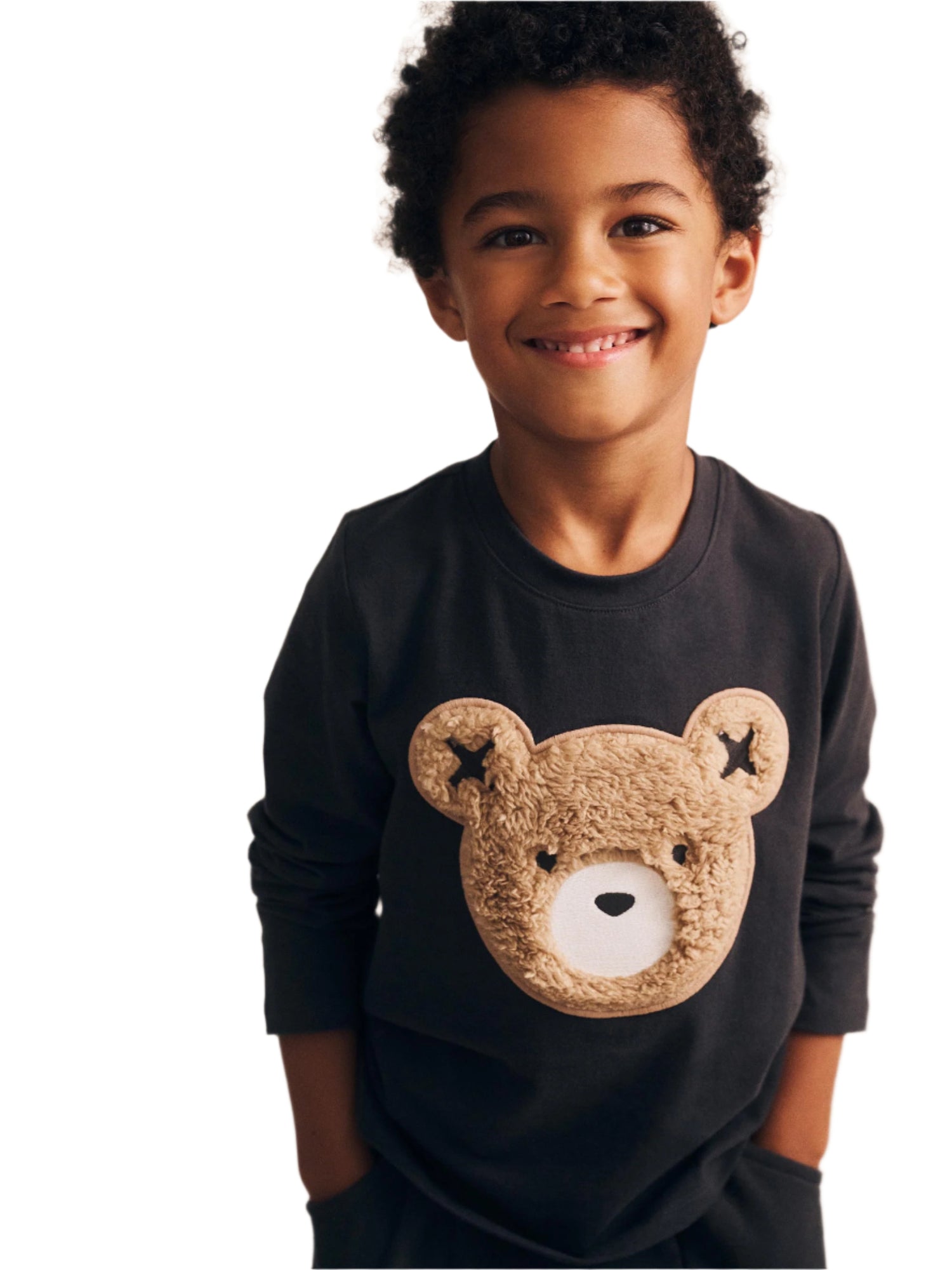 Stay warm and cosy in this fluffy terry sweatshirt. Made from organic cotton, it feels like having your best friend by your side thanks to the tummy-sized Huxbear embroidery always within arm’s reach. Baby sizes include stainless steel back snaps for easy dressing. Match it with our soft black Huxbear Track Pant for a co-ord look.