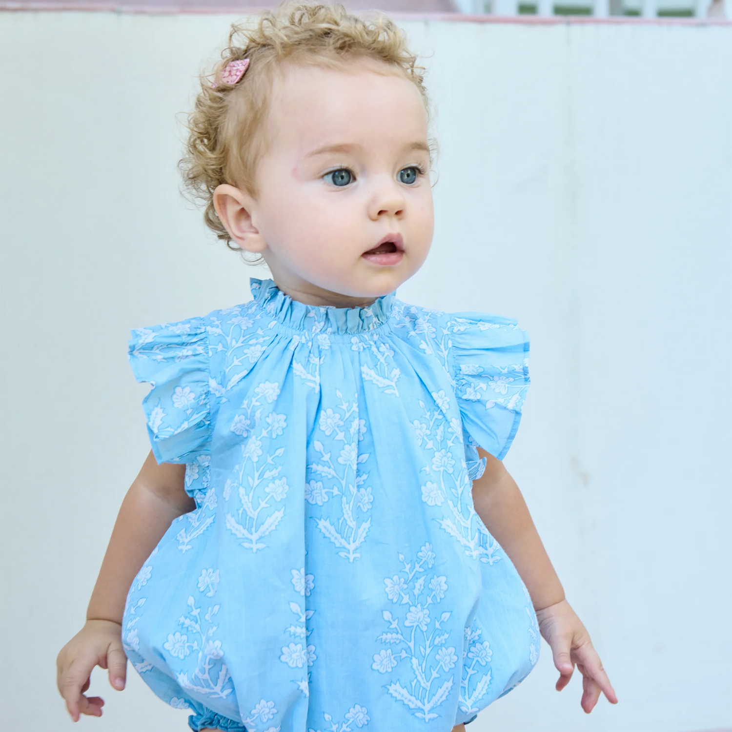 Sweet, airy, and designed for comfort. The Baby Girls Harper Bubble in Blue Dewdrop Blockprint features soft ruffles at the arm openings and neckline for added charm. Ruffle leg openings finished with blue pearl stitching add thoughtful detail, while metal snaps make diaper changes easy. An invisible zipper at the center back keeps the silhouette polished and picture-ready.