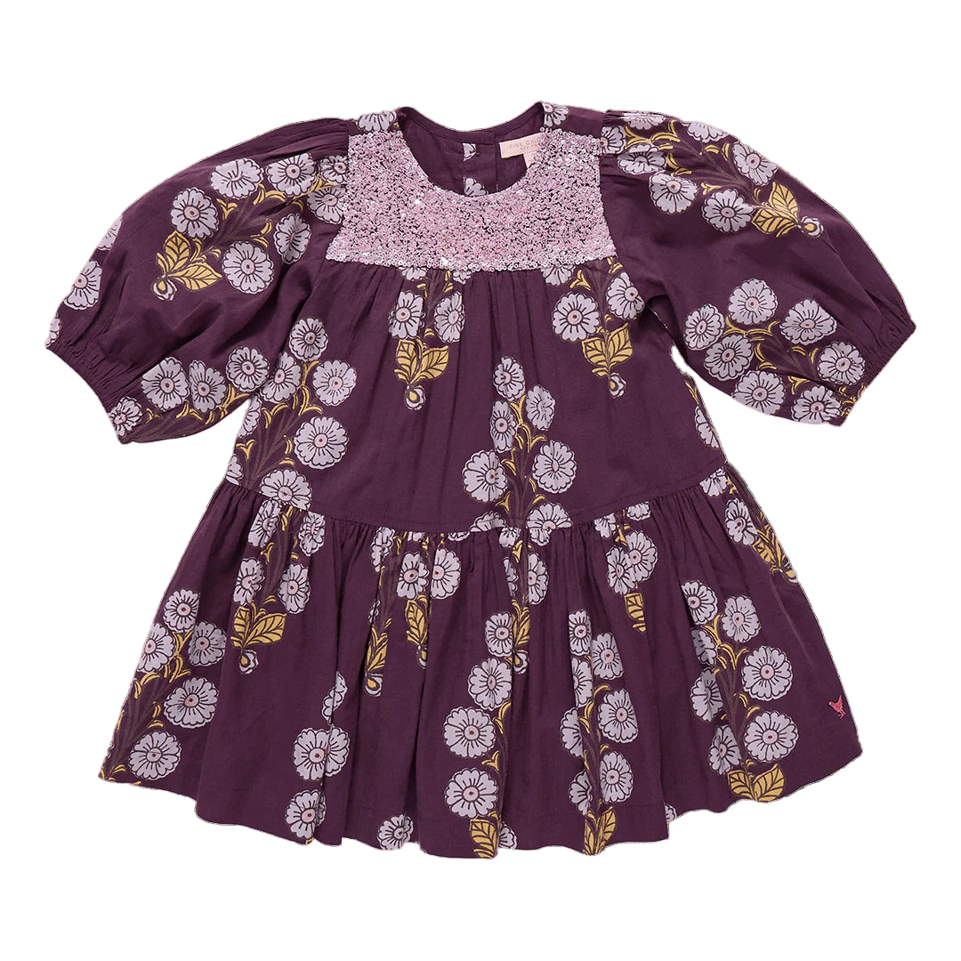 Sprays of lavender blossoms growing from wheat colored stems make a boho chic statement on our dazzling Girls Fiona Dress, fashioned in our Plum Buttercup Floral Block Print. This swingy tiered piece is party-ready with its sparkling green sequined detail at chest, delicately gathered puff sleeve and plum glitter buttons at the back.