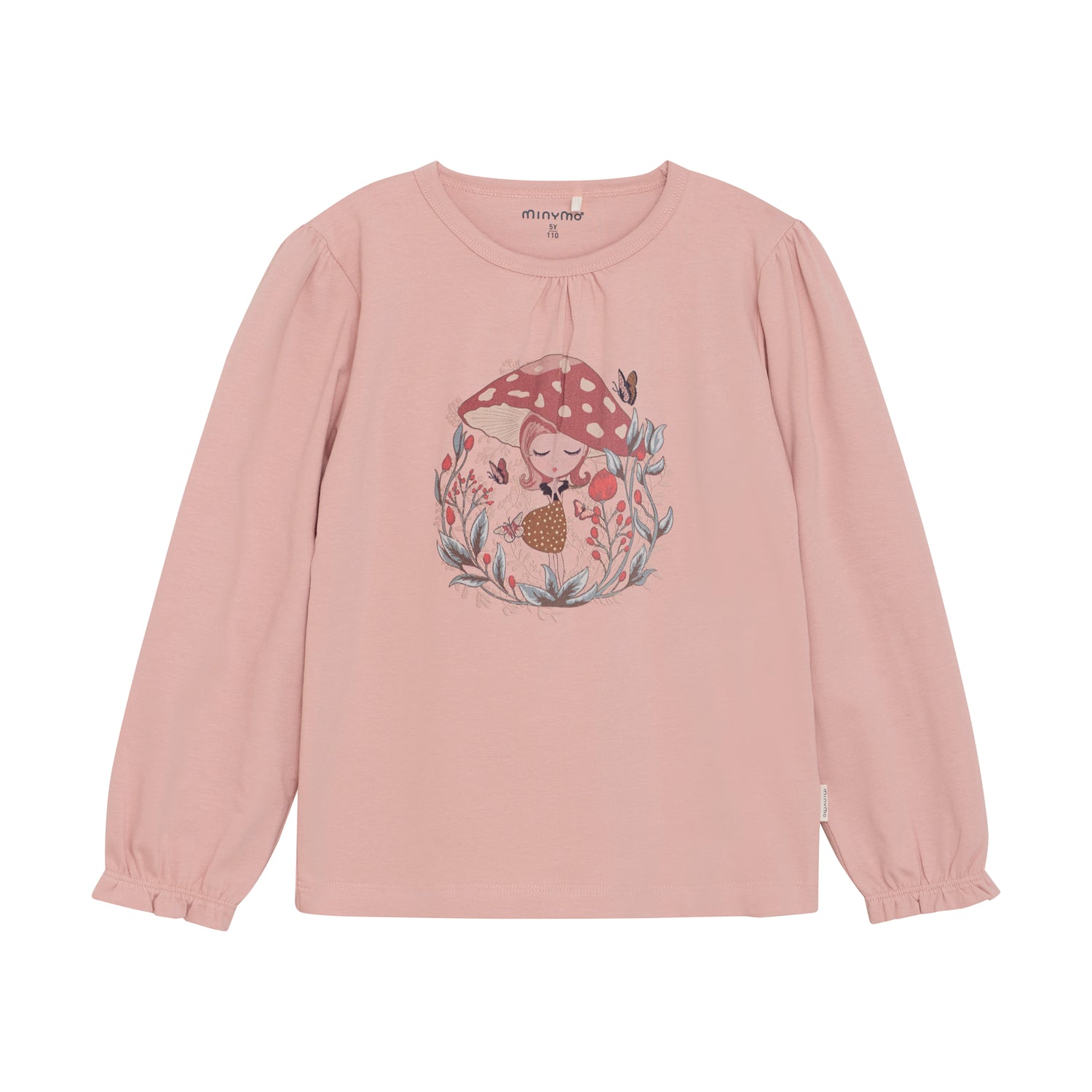 Long-sleeve T-shirt with a cute front print and puff sleeves featuring elastic and frill details at the cuffs, for a sweet and stylish look.