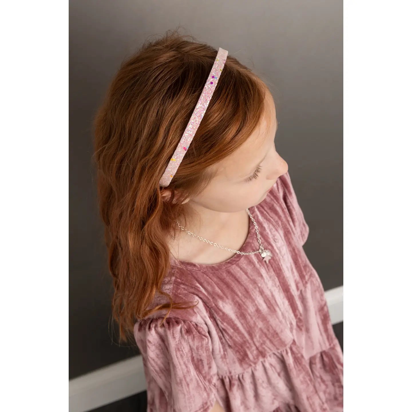 This 1/2 in. sparkly glitter headband with a teeth comb to help stay in place. Available in 4 colors. From left to right in the photo: White, Light Pink, Coral, Pink, Blue, Purple.