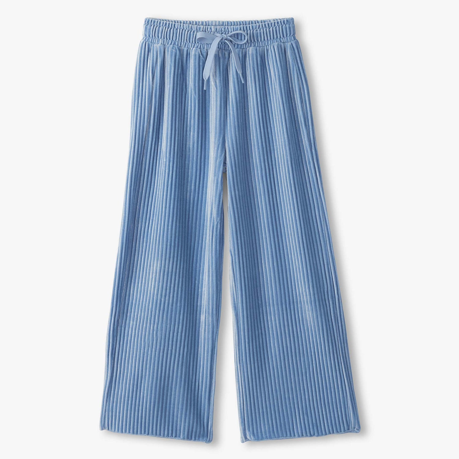 The Girls Cornflower Blue Pleated Velour Relaxed Pants in Blue bring effortless elegance to everyday wear. These ultra-soft, full-length pull-on pants are made from plush pleated velour and feature a wide elastic waistband, functional drawcord, and a soft light blue hue that’s perfect for school days.