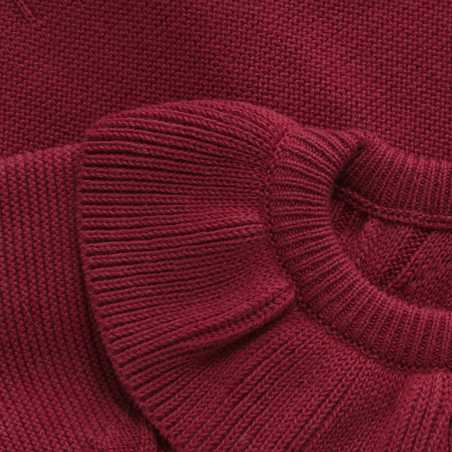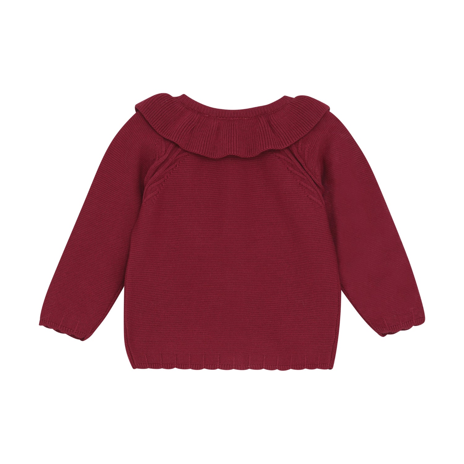 Soft cardigan with long sleeves and front button closure. The cardigan features delicate gathered details at the neckline and a scalloped hem. Perfect for layering.