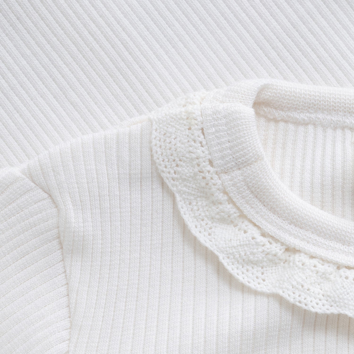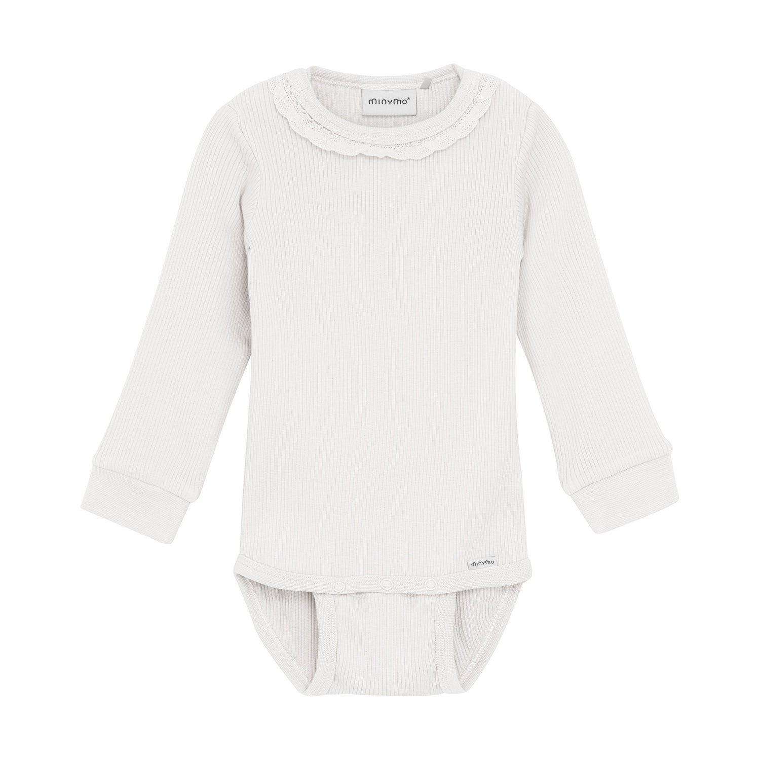 Nice solid-colored bodysuit from Minymo. The bodysuit is made from ribbed material, giving it a sleek look. It fastens with snap buttons between the legs, placed in two different spots so the bodysuit can grow with the child.