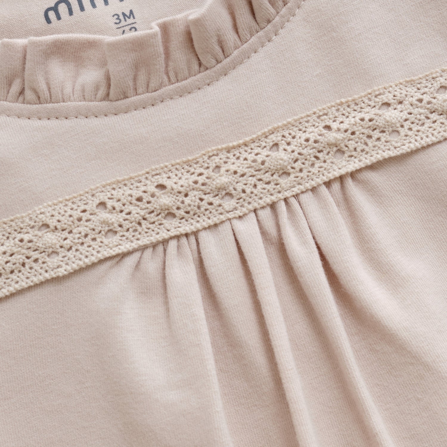 Cute long-sleeved bodysuit from Minymo. The bodysuit has lovely pleats at the chest, collar, shoulders, and wrists. It also features a simple embroidery across the chest, adding to the elegant look. The bodysuit has snap buttons between the legs, making it easy to fasten. It is made from a soft cotton blend, which feels comfortable against the skin.
