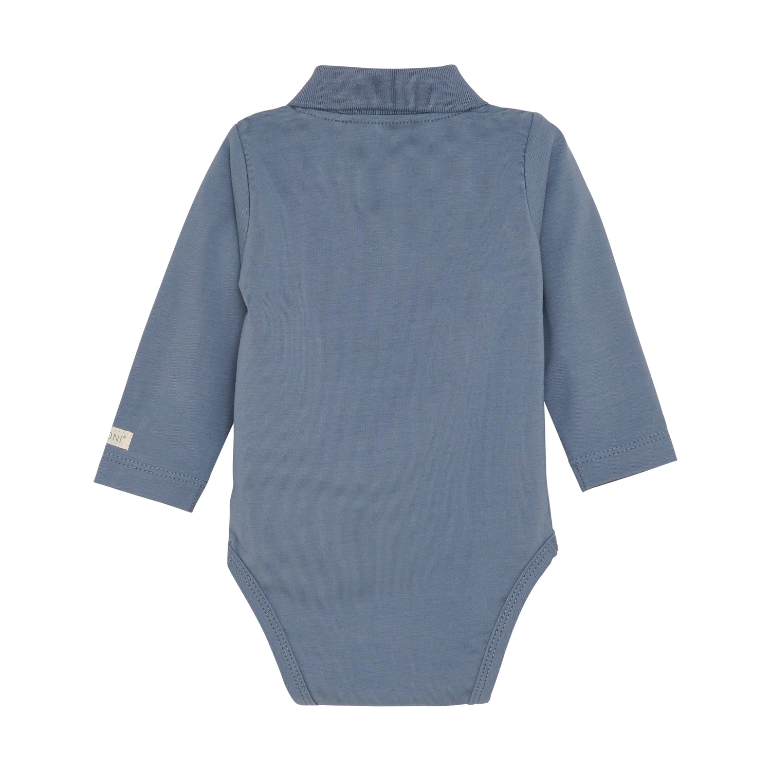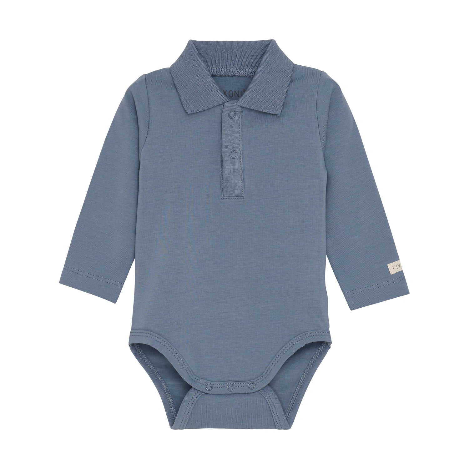 Cute FIXONI bodysuit with collar and long sleeves. The body closes with snaps at the back and between the legs. This is great with overalls or a pair of pants. You won't have to worry about the top inching up and it's easy to contain a diaper.