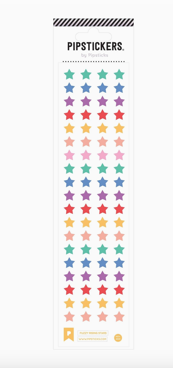 PipStickers are the PERFECT gift for the sticker lover in your life - even if it's you! These unique wood-free paper designs with fuzzy accents come on a clear backing and cannot be found anywhere else. Includes one 2" x 8" sheet of Fuzzy Fuzzy Rising Stars PipStickers and includes the Pipsticks manifesto.