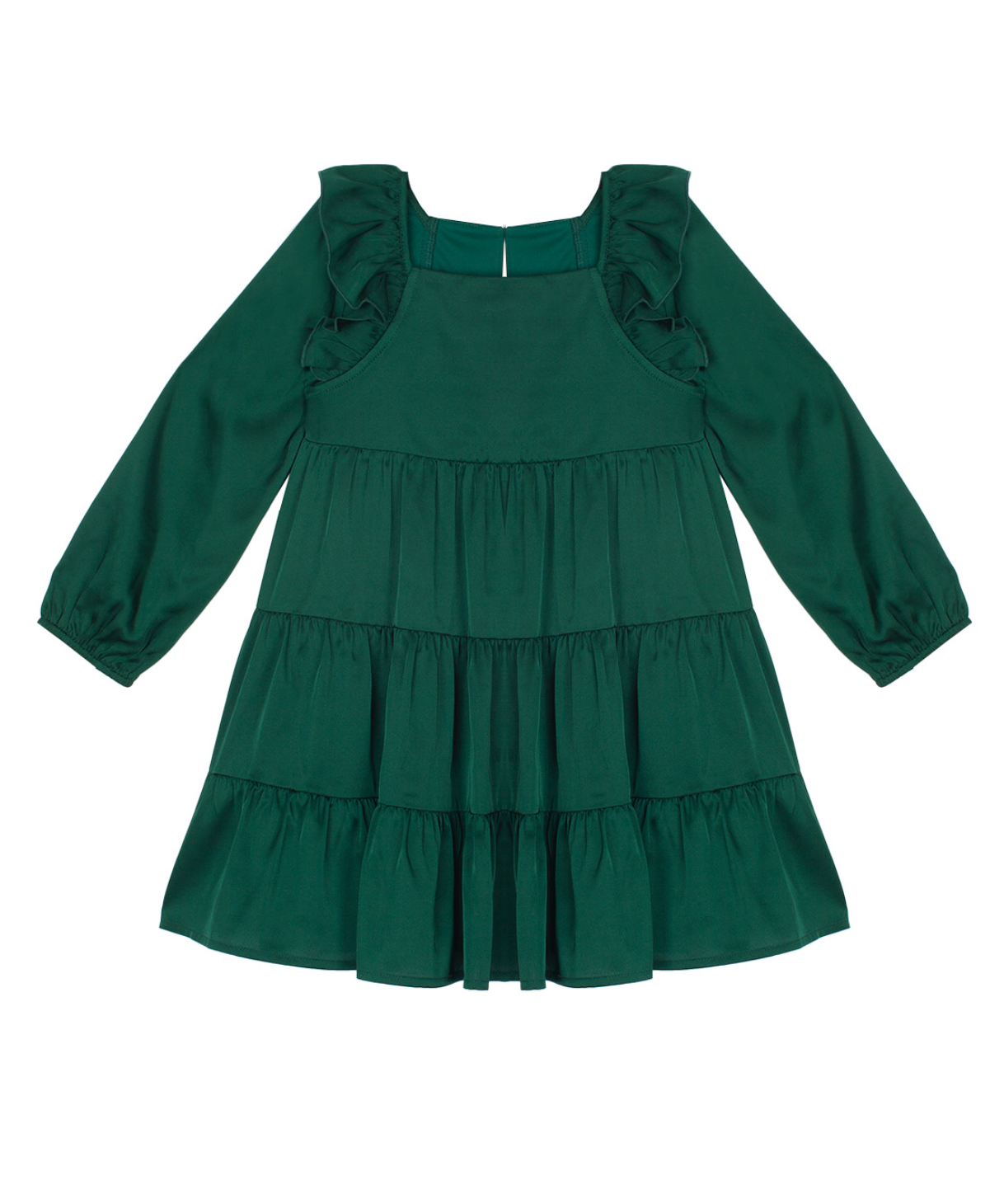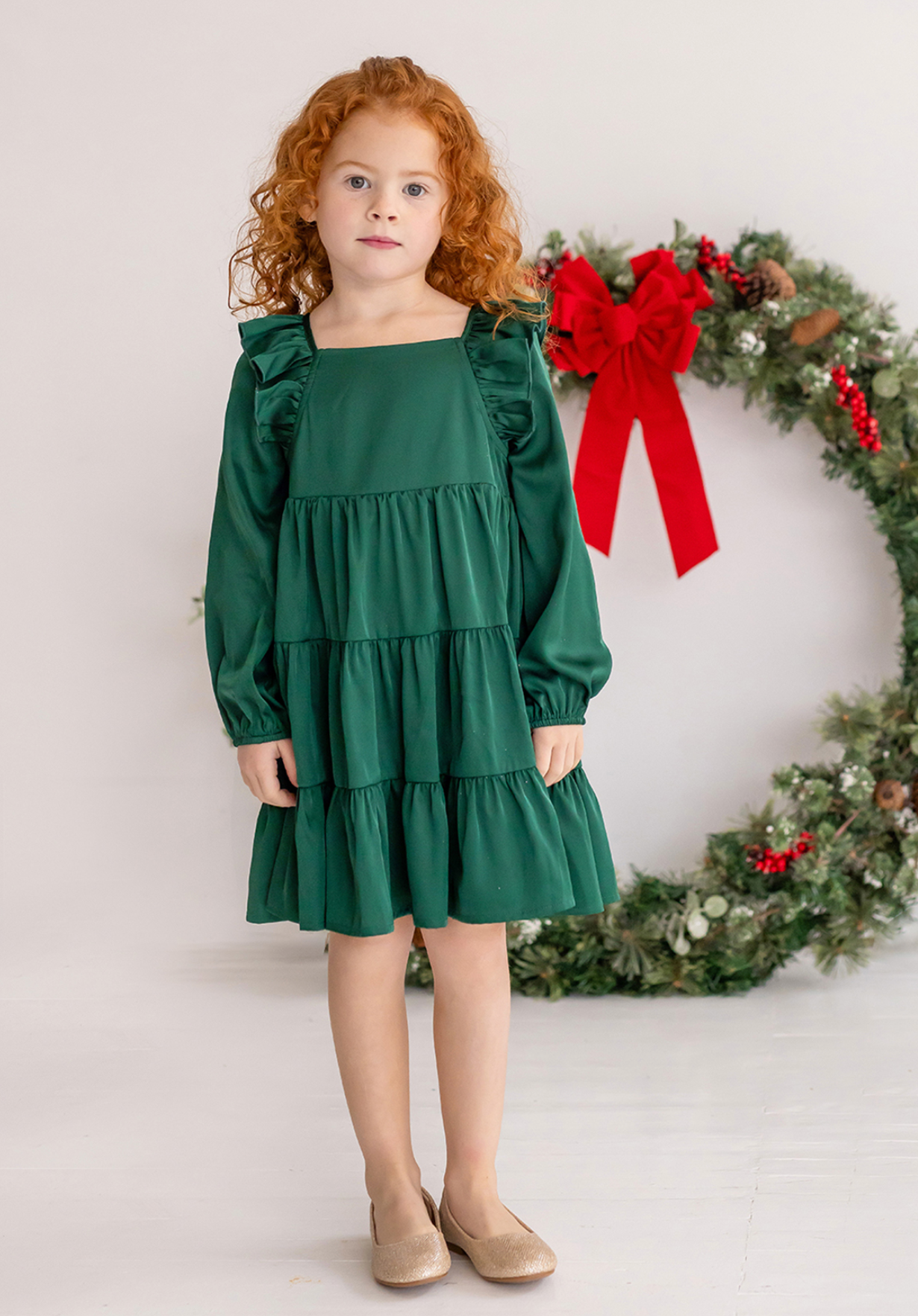 Celebrate in style with the Mistletoe Dress, crafted in a vibrant emerald green cotton. This dress features playful ruffle details on the shoulders and a tiered skirt that adds a festive flair. The long sleeves and comfortable fit make it perfect for holiday parties and family photos.