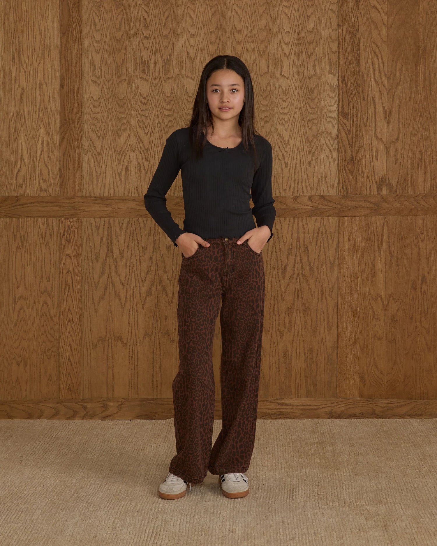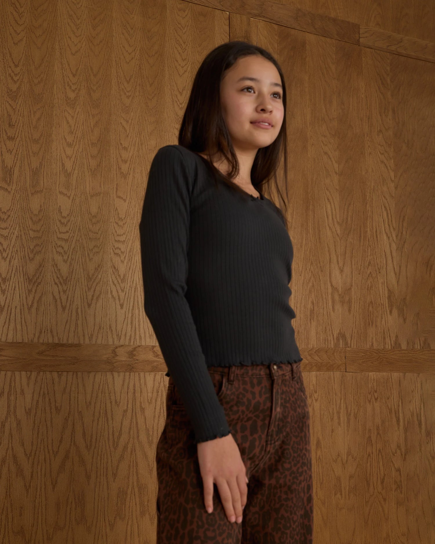 Ribbed Long Sleeve top featuring a delicate lettuce edge hem, lace-trimmed neckline, and a sweet satin bow.