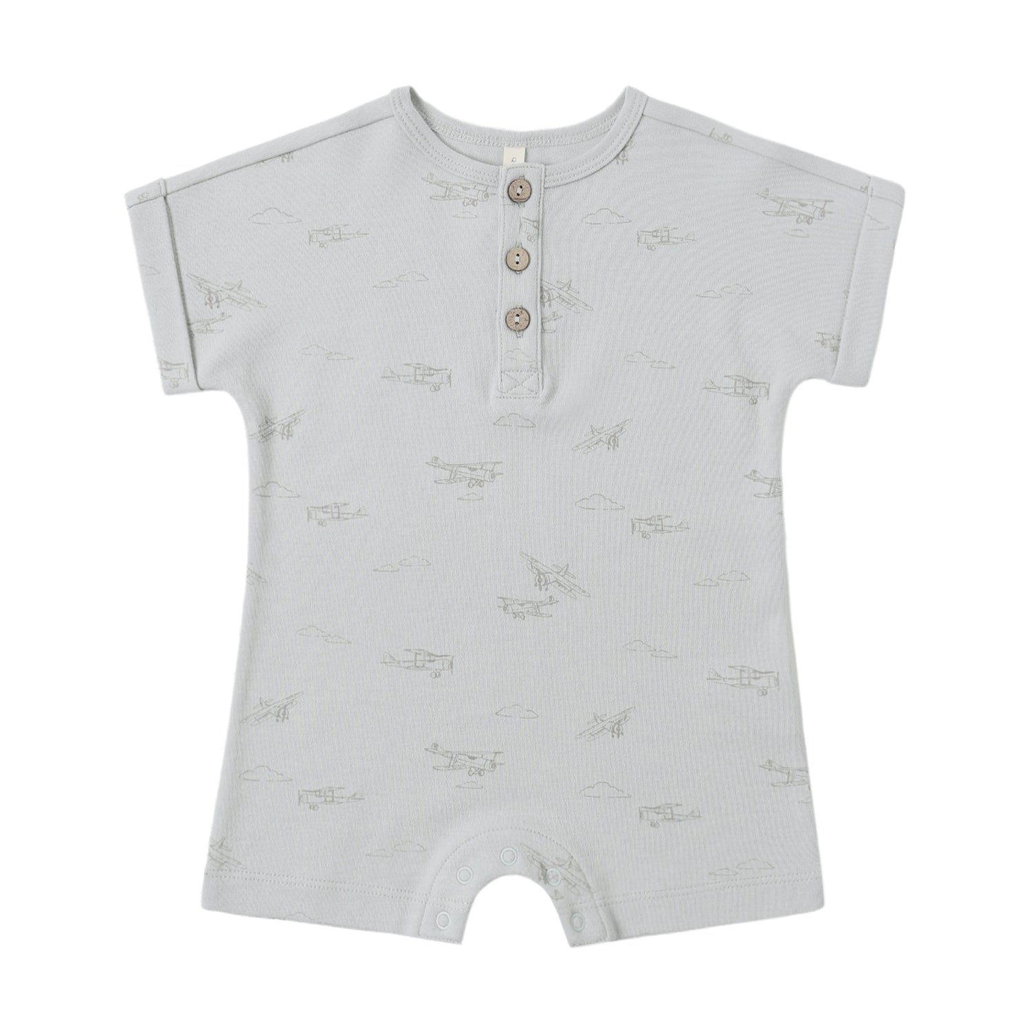 Quincy Mae's short-sleeve Grey Airplanes romper has folded cuffed sleeves, buttons down the chest, and snaps along inseam for easy changes - the perfect lightweight summer staple!