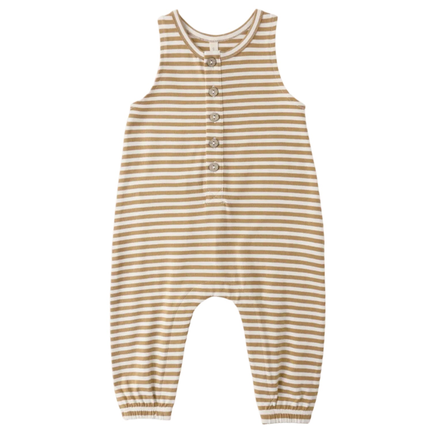 Organic brushed jersey sleeveless jumpsuit with coconut buttons down the chest, and hidden snaps along inseam for easy changing.