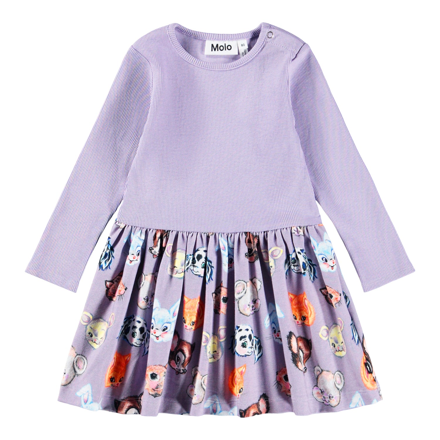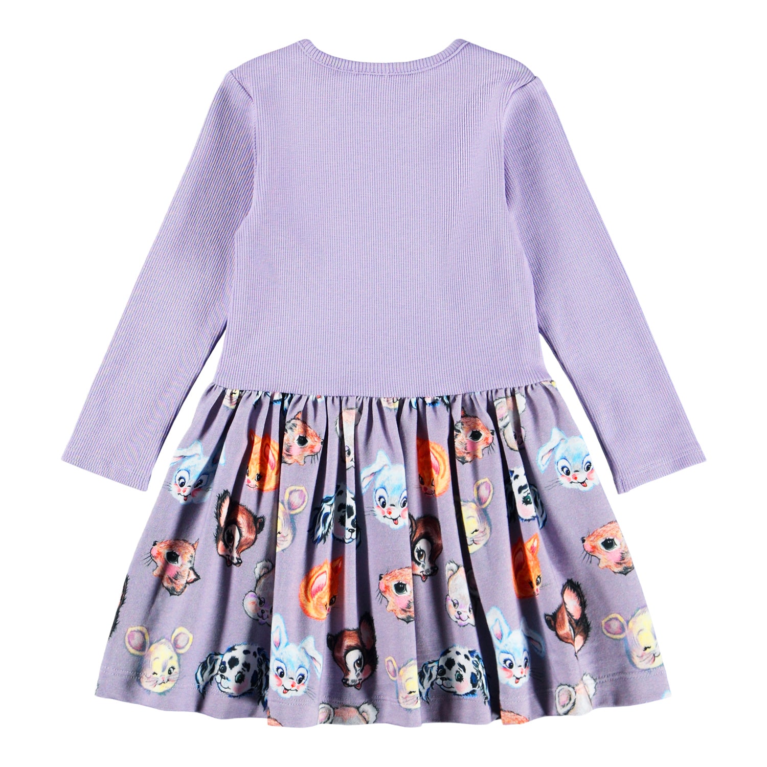 Long-sleeved dress for the little ones made of organic cotton. The dress is light purple with a print of drawn animals on the skirt. The top is slim-fitting in ribbed jersey and has a round neckline with a button on the shoulder to make it easy to put on and take off. The sewn-on skirt gives a nice volume.