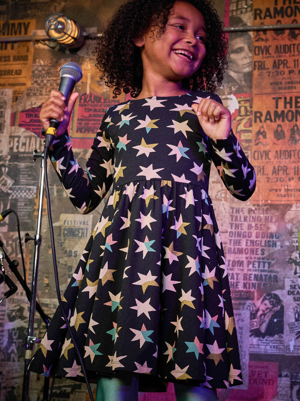 A Tea favorite, this ballet-inspired dress twirls with ease thanks to its circle skirt and fitted bodice. The long sleeves and soft cotton jersey make it an everyday essential, while the vibrant, globally inspired prints add artistry and joy to every outfit. Designed for comfort and movement, it's a style little ones will reach for again and again.