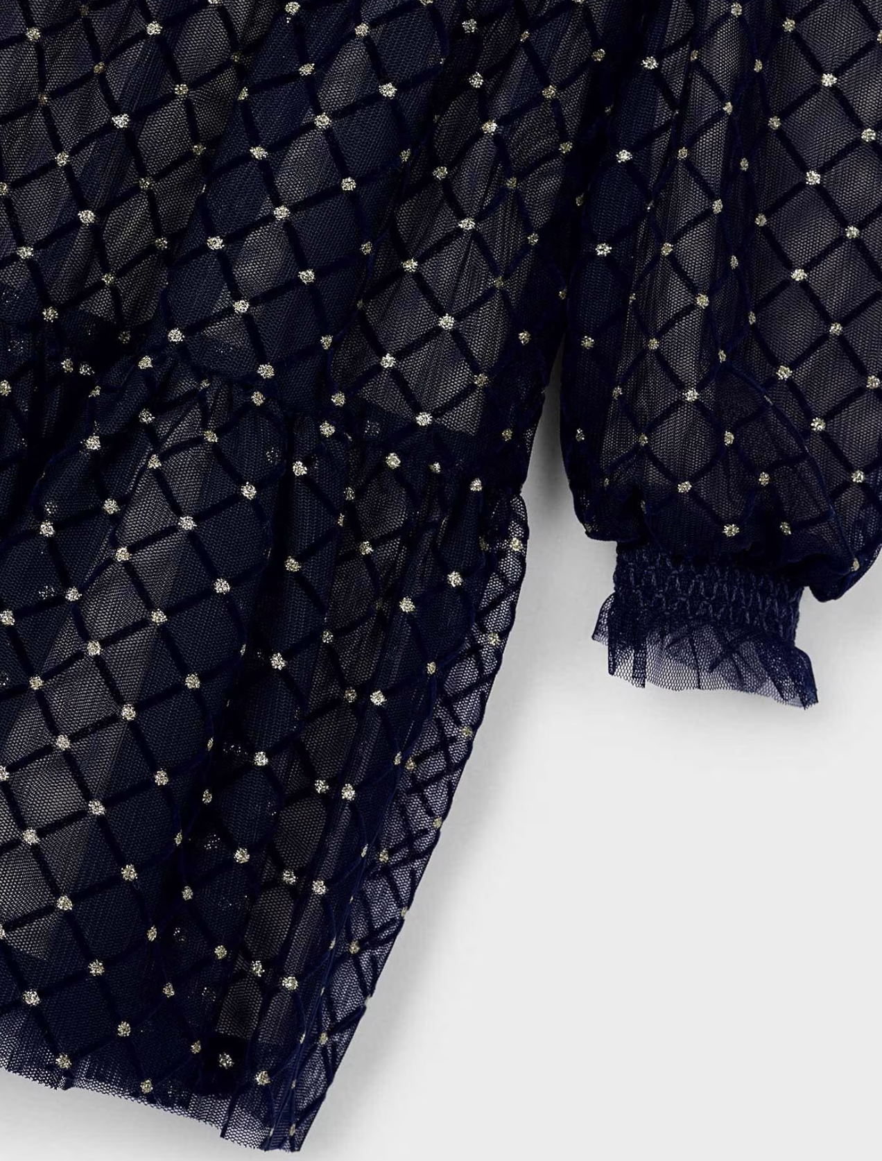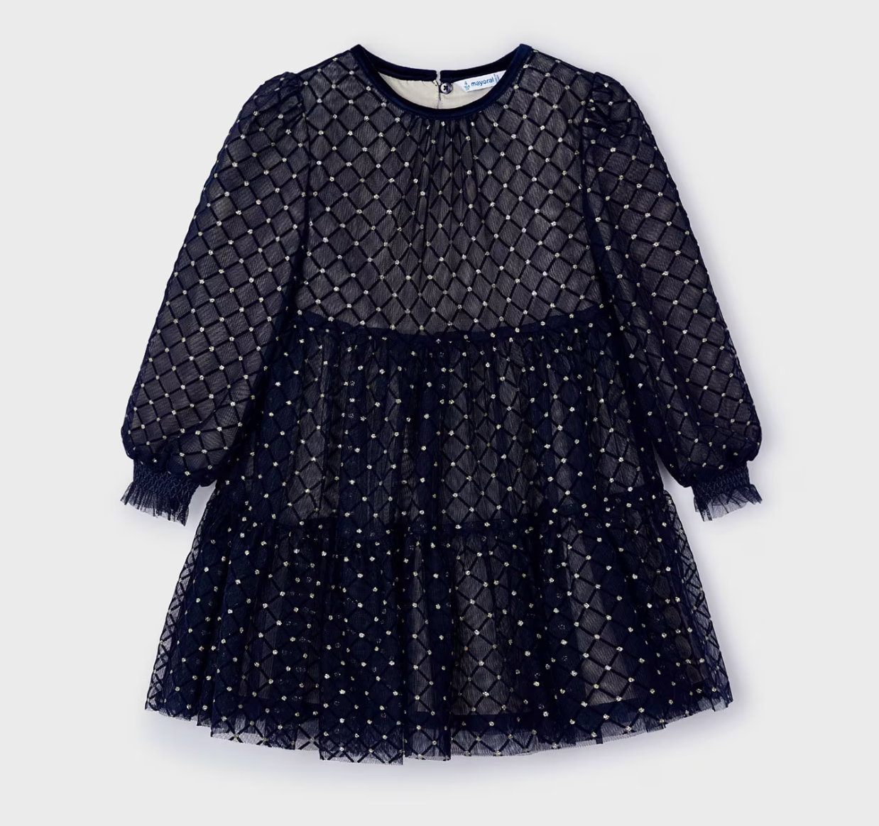 Add a touch of sparkle to your holiday and special occasion looks with our Navy Lattice Dress. Perfect for standing out in a sea of basic black dresses.