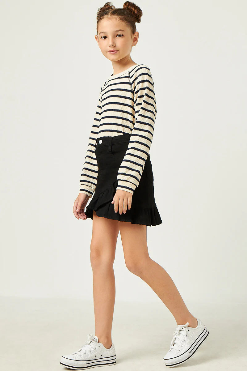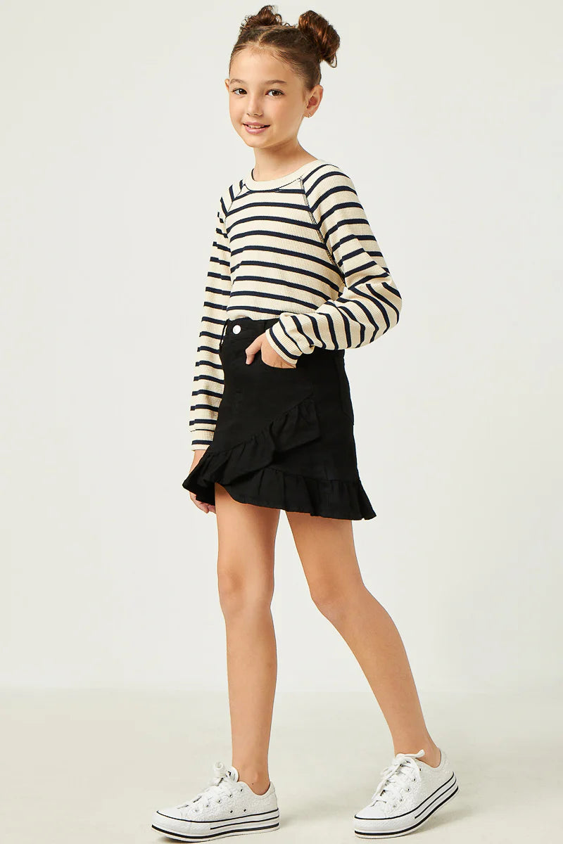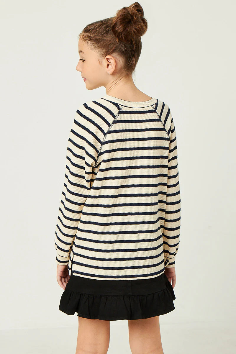 Get cozy and comfortable in our Navy Stripe Waffle Raglan Top! Made with waffle knit fabric, this top features a round cut neckline and long sleeves for a casual yet stylish look. Perfect for those chilly days when you want to stay warm and fashionable.