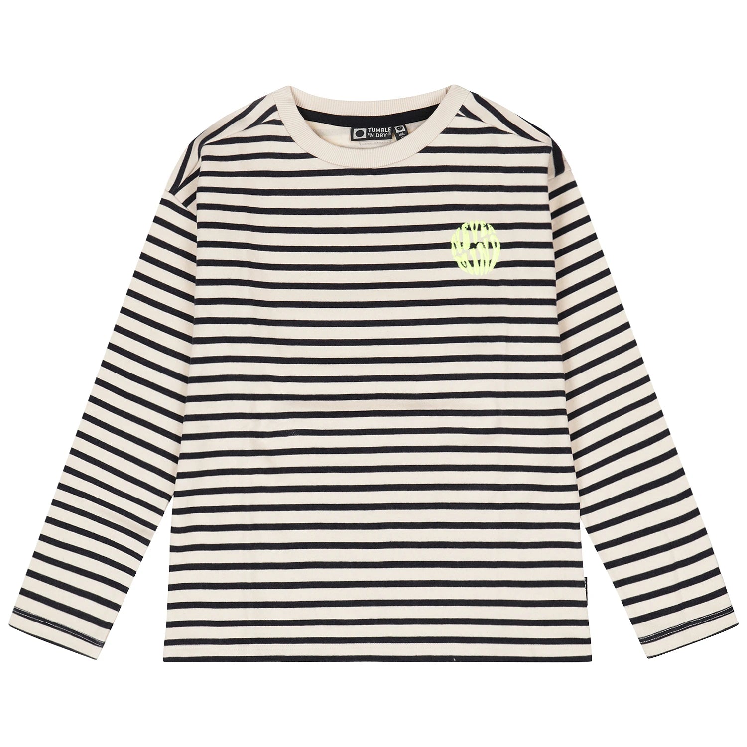 This dark blue striped longsleeve top made of organic cotton features brightly colored "Nevermind" embroidery on the chest.