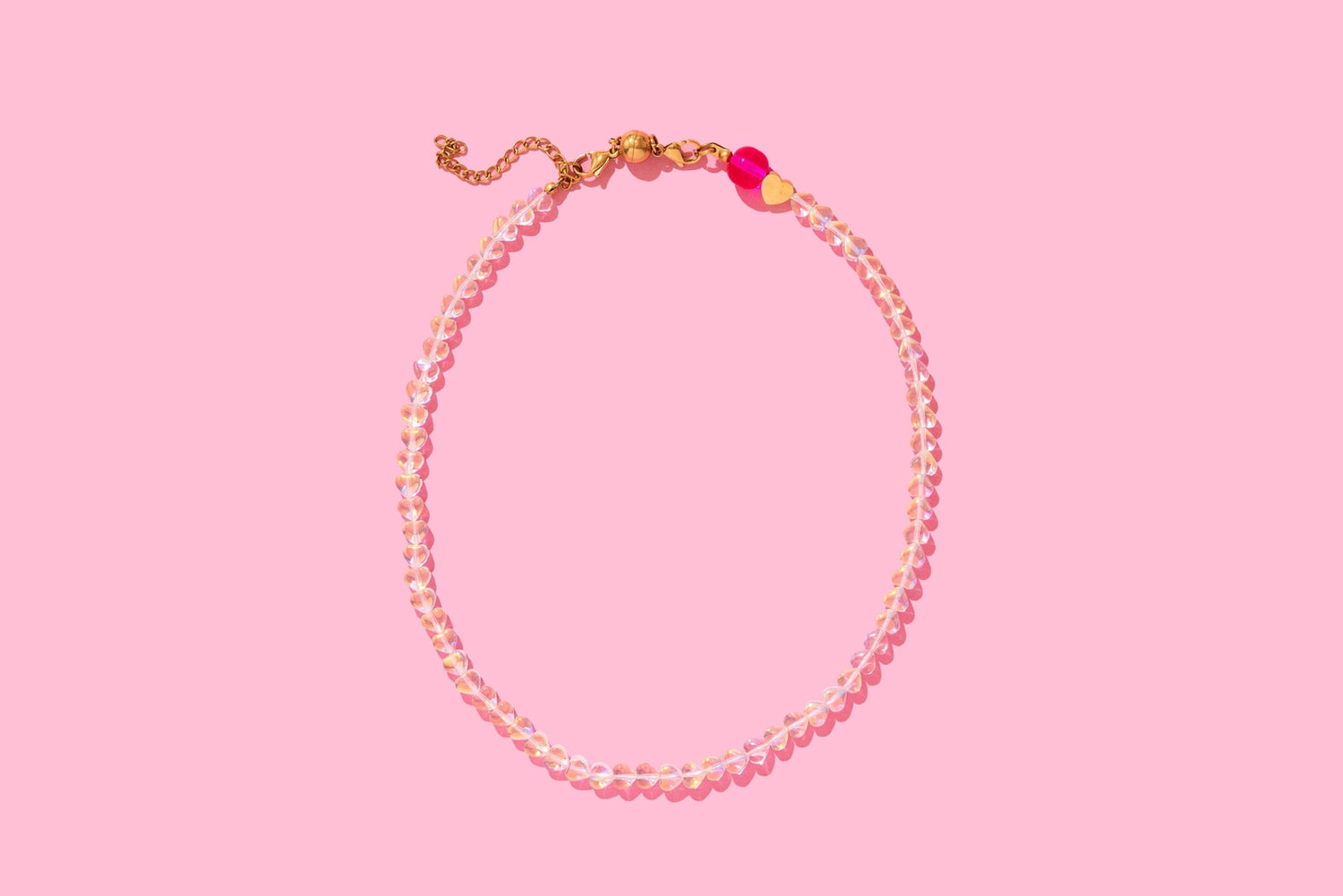 ♥ Chain length: 15" ♥ 2.5" extender ♥ Magnetic clasp closure + extender ♥ Heart-shaped glass beads♥ 14k gold plated stainless steel extender and clasp ♥ Imported