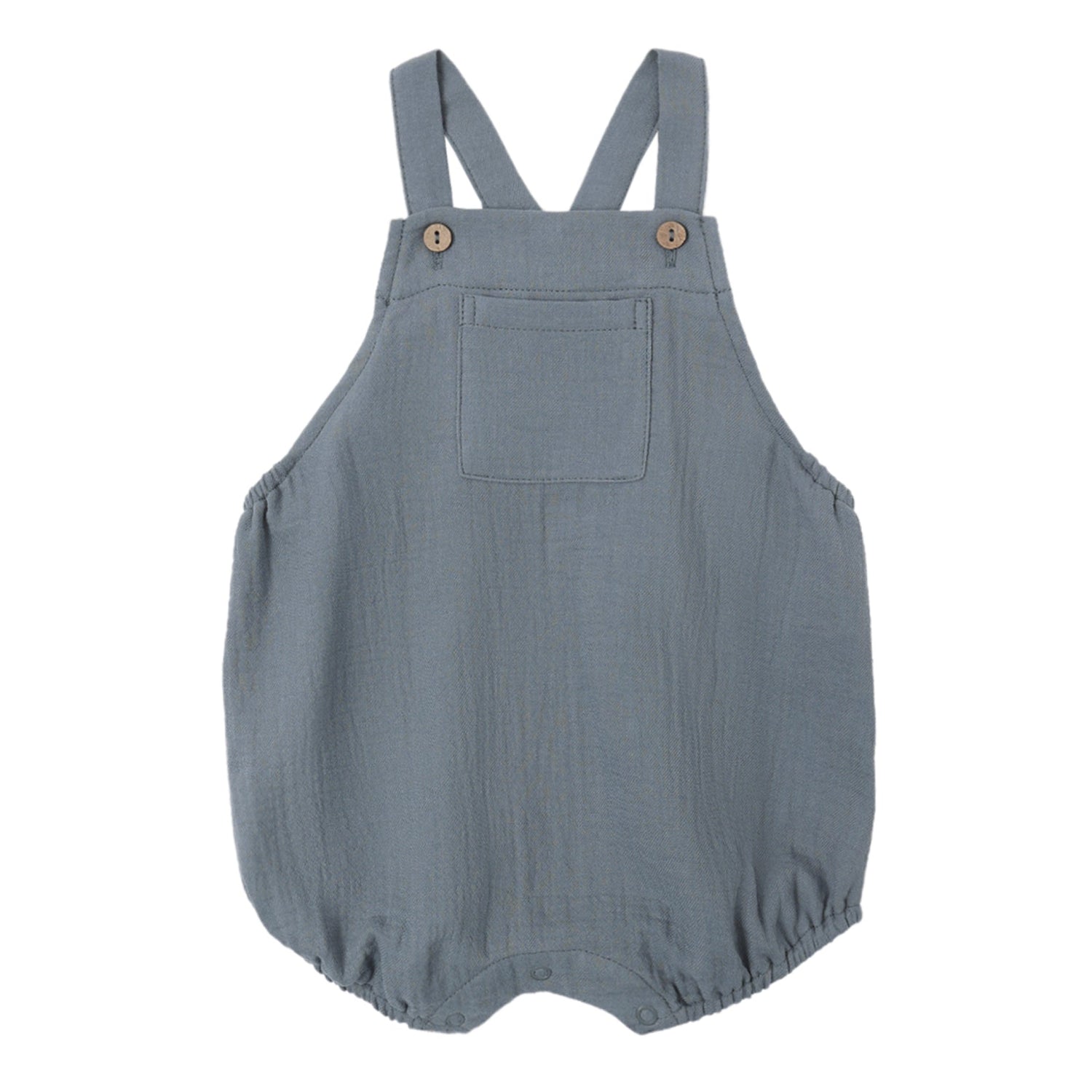 Woven overall romper featuring buttoned straps, an open bib pocket, and elastic leg openings.