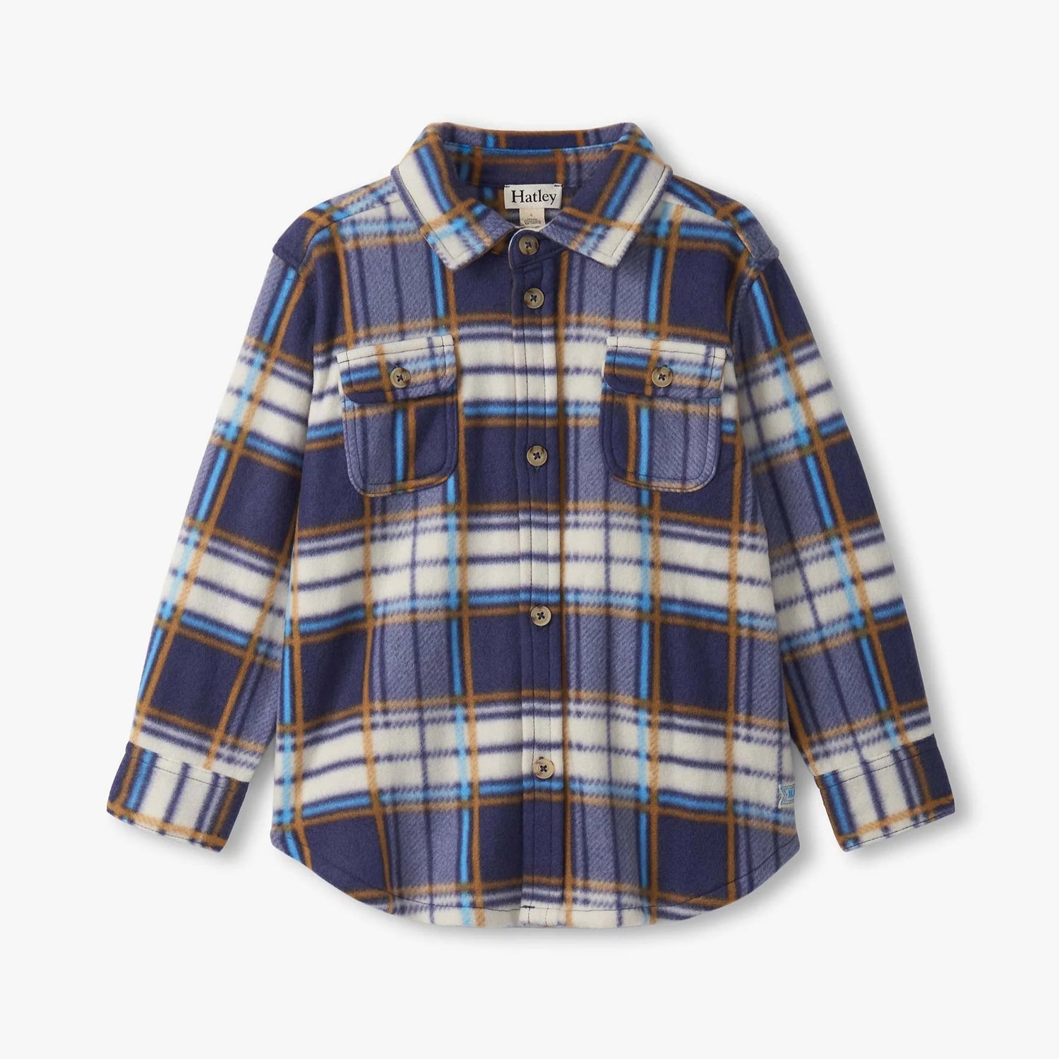 The Boys Mountain Top Plaid Fleece Button-Up Shirt combines the look of a classic button-down with the cozy feel of fleece, making it a versatile cold-weather staple. Crafted from soft 100% polyester fleece, it features a large plaid check in shades of navy, white, brown, and light blue for a rugged outdoorsy vibe. Designed with a two-piece collar, a separate center-front placket, and brown buttons, it offers traditional shirt styling with added warmth. Two chest flap pockets with button closures, long sleeves with buttoned cuffs, and a curved hem complete this functional yet stylish layer.