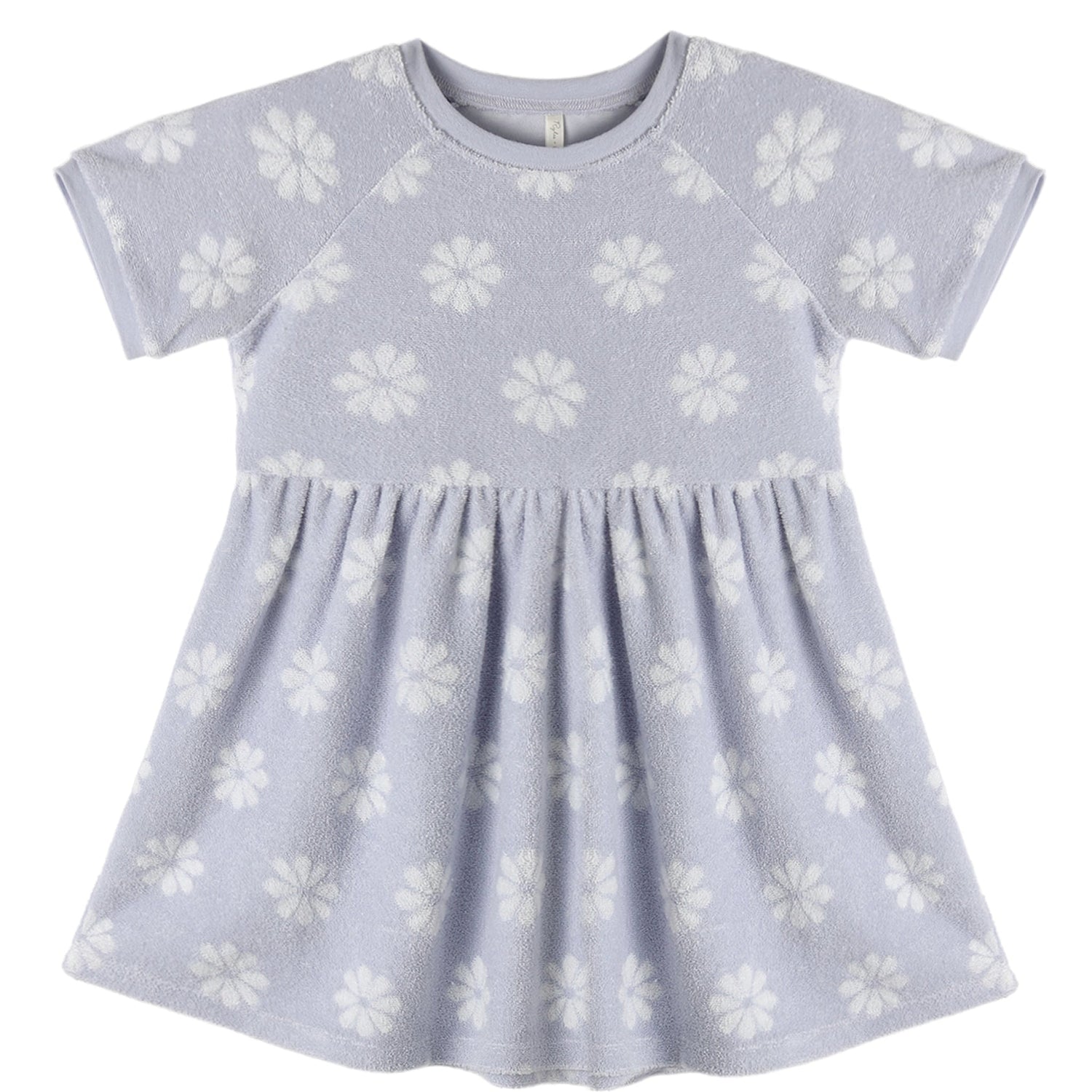 This short sleeve raglan dress is an easy pullover style with ribbed cuffs, and a gathered skirt in a comfy soft-washed french terry fabric.