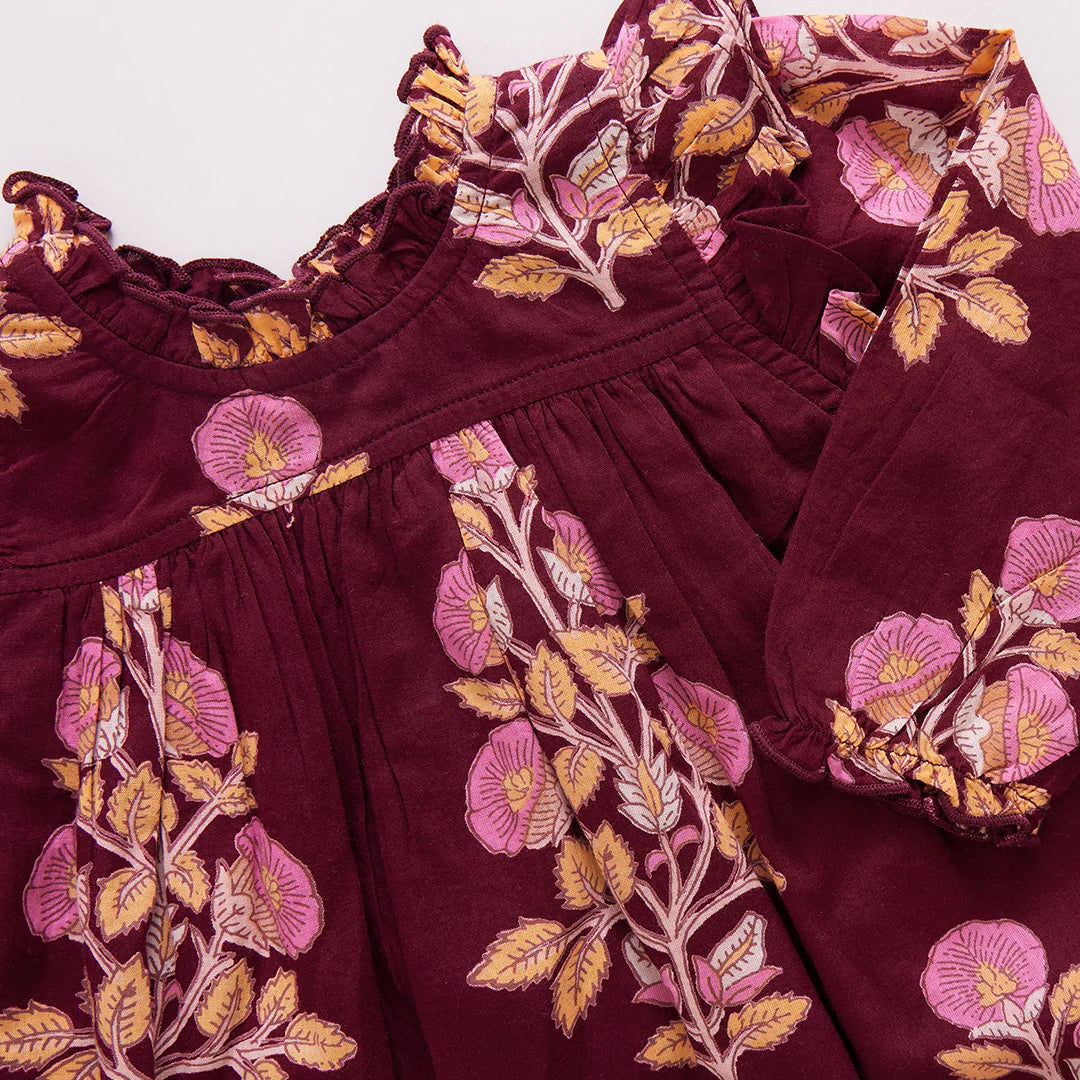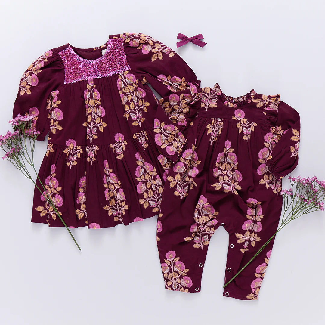 Our Baby Girls Kalani Jumper dresses up beautifully in our rich and vibrant Burgundy Bouquet Floral, a stunning interpretation of the traditional vintage block prints that we love so much. Ruffles at the sleeve, shoulder and neck give this piece a refined sensibility. Ring snaps at the legs allow for easy diaper changes. You'll find Burgundy Bouquet Floral throughout the Fall Collection making Mommy & Me and Sibling looks easy to put together.