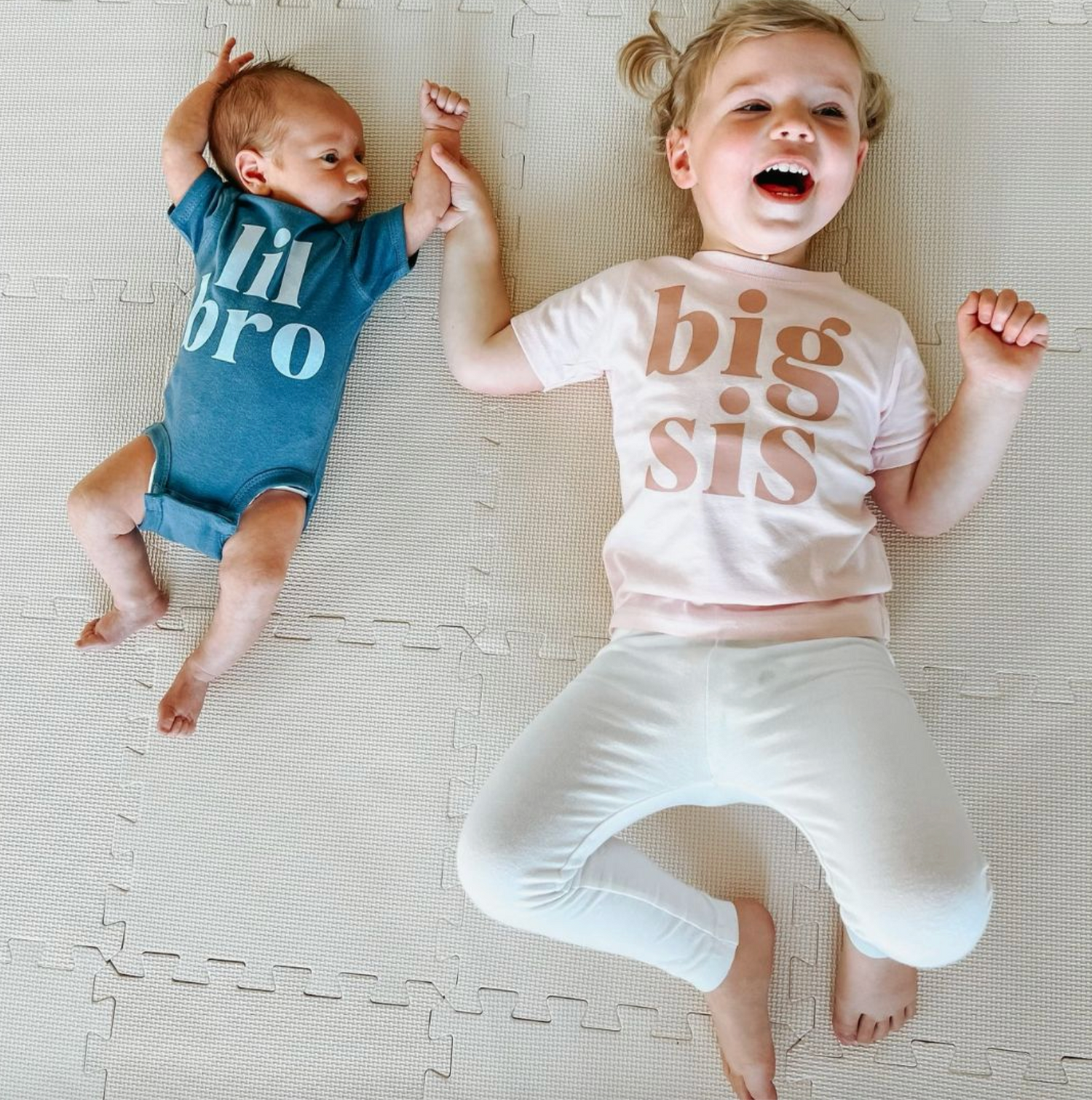 Is someone about to become a big sister?! This super soft dusty rose tee shirt is decorated with a white "big sis" graphic. Customers love to dress their first born in this tee shirt as a way to announce that a new little brother or sister is on the way. Once the gender of the new baby is revealed, coordinate this tee with a lil sis or lil bro outfit for an adorable sibling pairing.