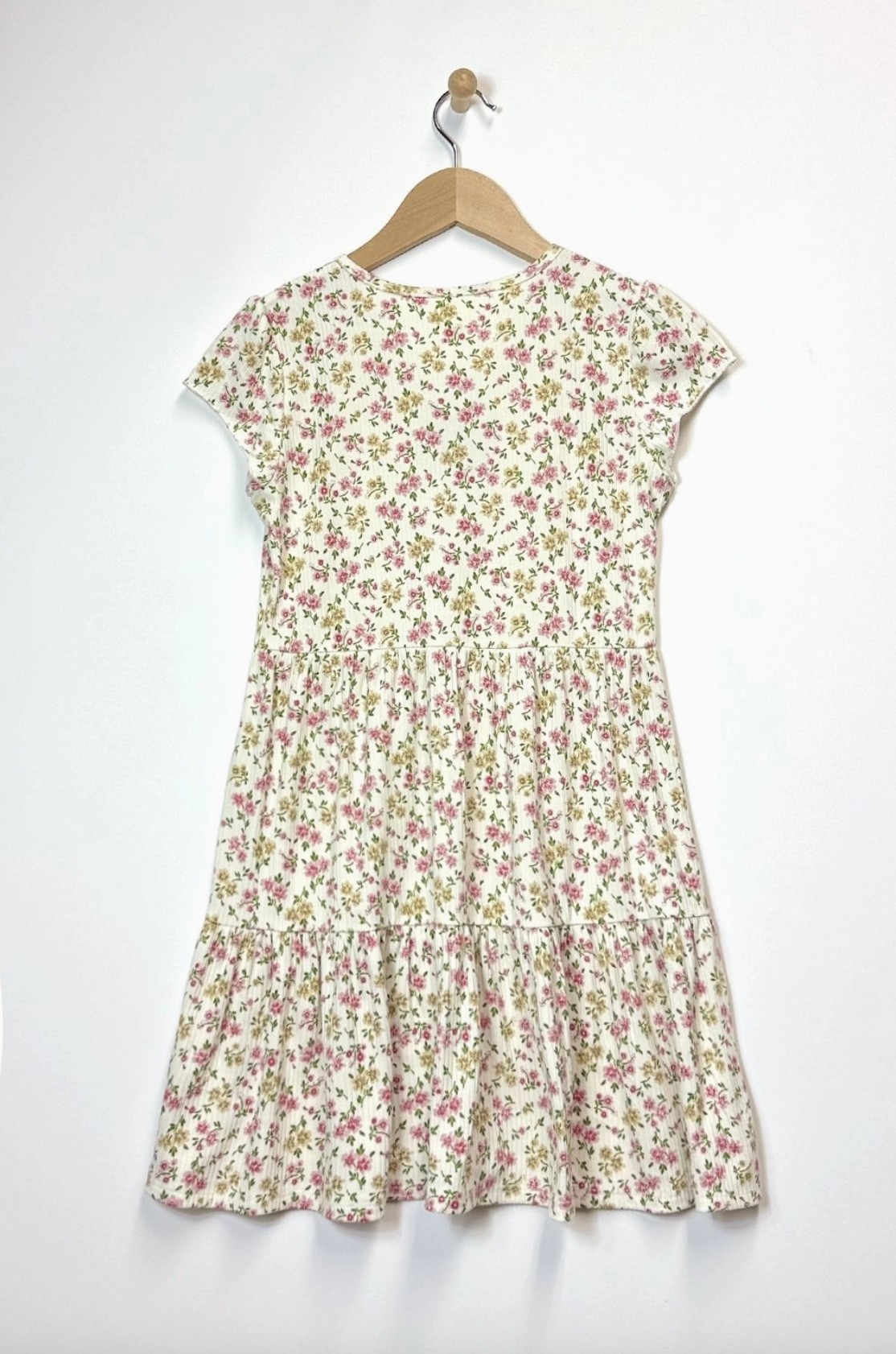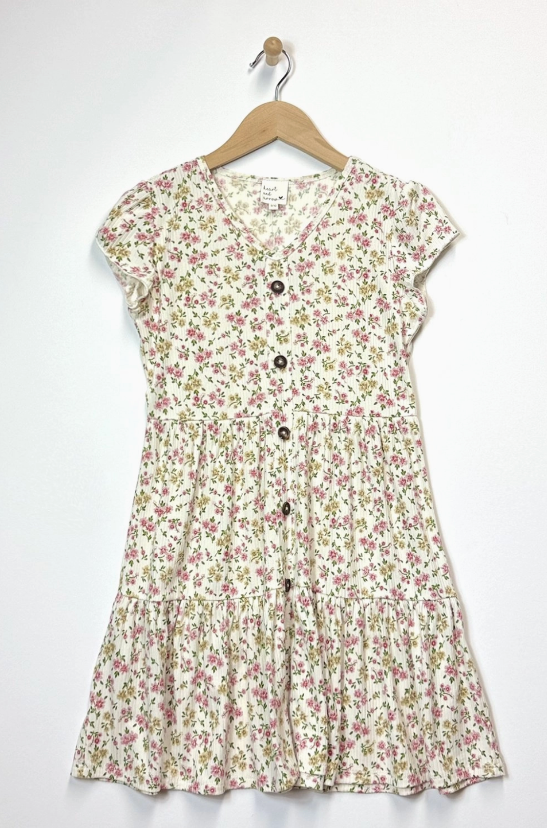 Add charm to your wardrobe with this sweet floral dress. Crafted from a lightweight, breathable fabric, it features an allover delicate pink and green floral print on a soft ivory background. The cap sleeves and V-neckline offer a classic, comfortable fit, while the wooden-style button-front detail adds vintage-inspired character. Designed with a gathered waist and tiered skirt, this dress brings a playful yet timeless silhouette that’s perfect for everyday outings or special occasions.