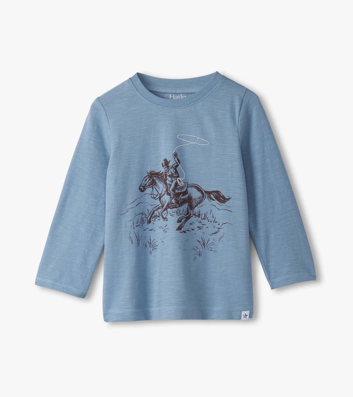Give your little one a taste of the wild west with the Baby & Toddler Boys Ranch Graphic Lounge Set in Blue! The heathered pale blue long-sleeve crew neck tee features a charming print of a cowboy riding through the desert, accented with a playful embroidered white lasso for added texture. It pairs perfectly with soft heathered brown sweatpants, designed with an elastic waistband, functional white drawstring, cuffed ankles, and handy slash pockets.
