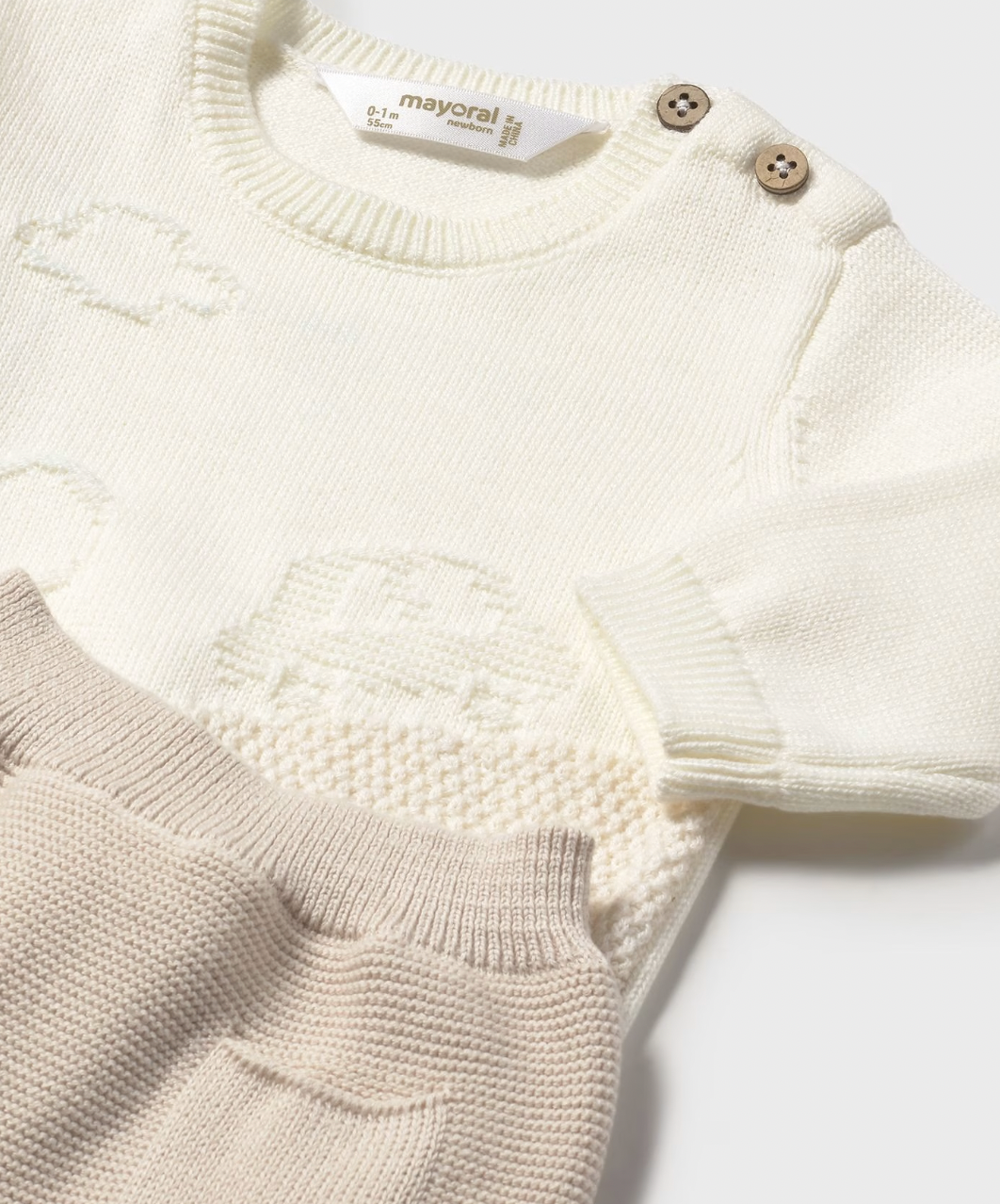 Long sleeved Sweater for newborn baby boy. Round neckline. Buttons fastenings on the shoulder. Knitted fabric, soft and pleasant to the touch. Jacquard stitch designs.