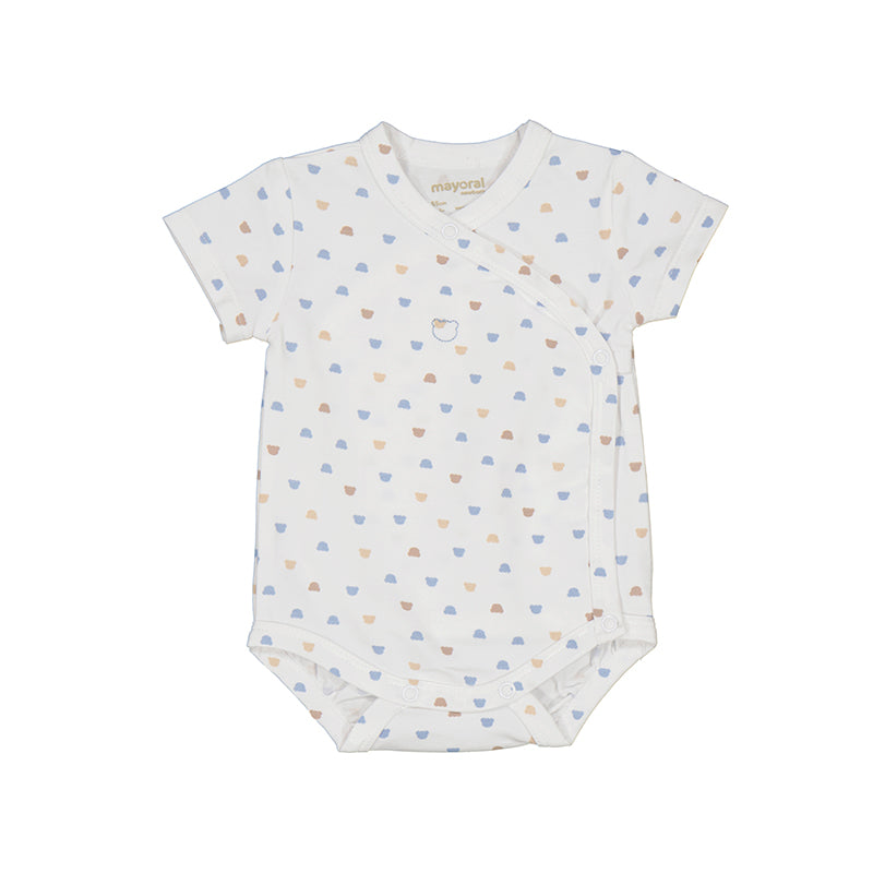 Kimono-style bodysuit for sizes 0-1m thru 4-6m, but starting with size 6-9m the garment is a crewneck bodysuit.