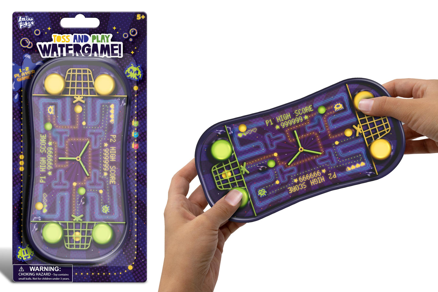 Hand held water games for one or two players.